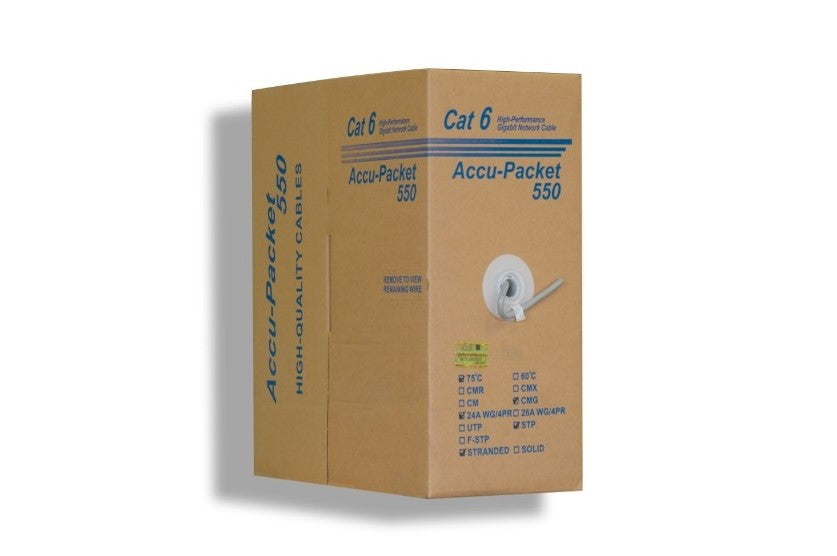 Our 1000-ft category 6 stranded bulk cable is best suited for patch (outside wall) cabling applications. Stranded core conductors allow the cable to be very flexible. This flexibility allows the cable to be flexed many times without negative effects on its performance. As such, the stranded bulk cable is perfect for building patch cables. Furthermore, with its shielding, it is ideal for installation in high EMI/RFI environments.